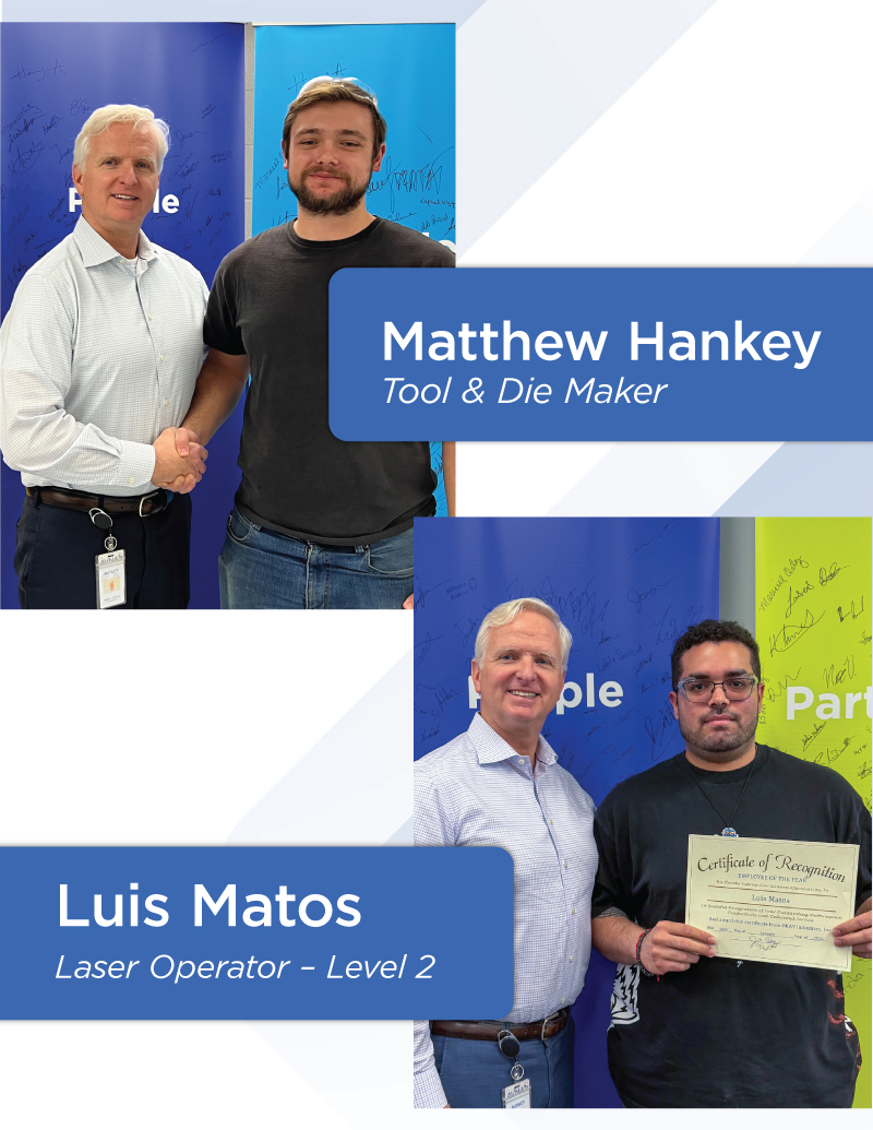 Luis is recognized for his leadership within the Laser Technician group, consistent commitment to quality, and collaborative approach that strengthens teams across the organization. Matthew is honored for his growth as a Tool & Die Maker, contributing to critical tooling and R&D projects while demonstrating a strong problem-solving mindset and dedication to continuous improvement.